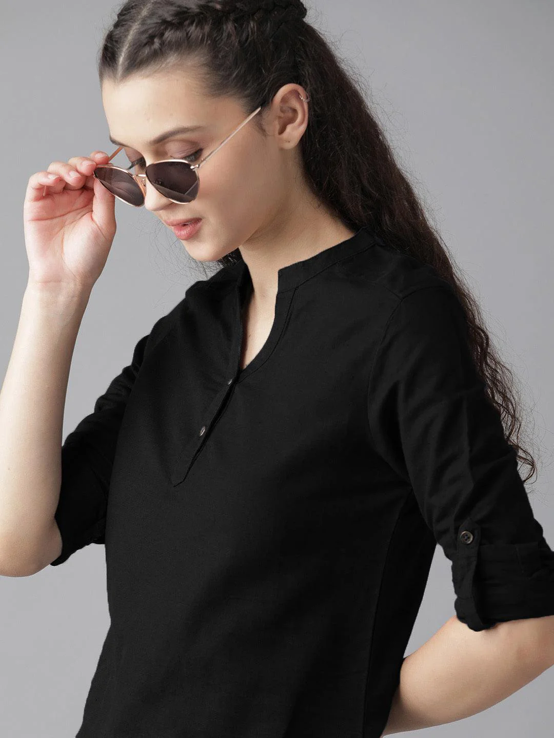 This black cotton linen kurta for women features roll-up sleeves and a short length, making it perfect for casual or formal occasions. The comfortable fabric and versatile design make it a must-have piece for any wardrobe. Elevate your style with this chic and functional kurta.